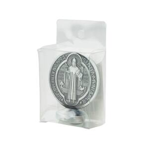 Enfeite decorativo de metal no formato do medalhão de São Bento dourado ou prateado com 5,5cm de altura. Base da imagem vem com adesivo para colar em superfície plana e limpa como interior de carro.