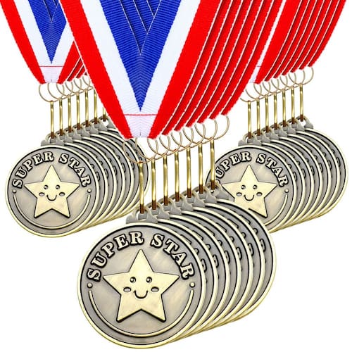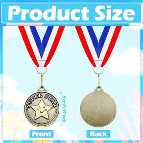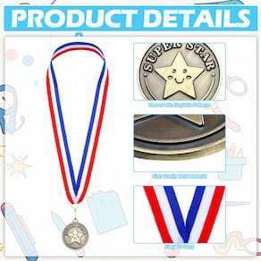 - Embalagem generosa: cada pacote inclui um total de 100 medalhas de super estrelas e 100 fitas de pescoço, o que permite que um grande número de prêmios sejam distribuídos, fazendo com que todos tenham uma chance justa de receber uma medalha e uma fita de pescoço por sua impressionante conquista