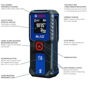 Medidor de distância a laser BOSCH GLM100-23 BLAZE de 100 pés, inclui 2 pilhas AA - FÁCIL DE USAR: o layout simples e fácil de usar oferece operação com dois botões: um para medir e outro para arredondar.