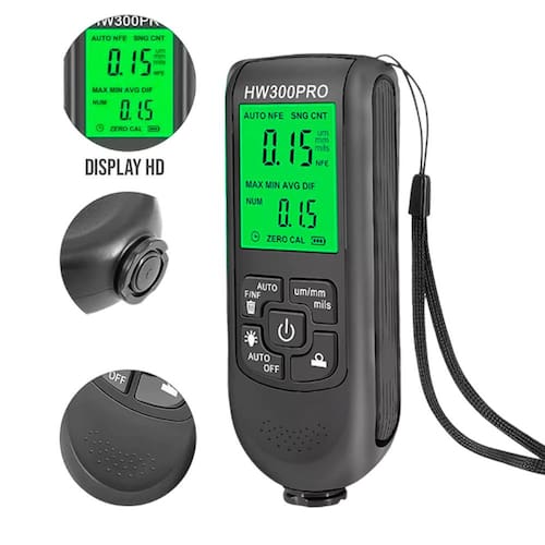 Medidor Fe e NFe: Alterna entre superfícies ferrosas e não ferrosas, ideal para diferentes aplicações industriais. Display HD: Tela LCD com informações detalhadas, incluindo espessura máxima, mínima, média e diferença. Calibração Multi-ponto: Ajustes de calibração precisos em diversas espessuras (0.05 mm a 2.00 mm) com placas padrão de alumínio. Sonda Sensível: Detecta com precisão revestimentos em substratos metálicos, garantindo medições consistentes. Design Antiderrapante: Corpo ergonômico com ranhuras para manuseio confortável e seguro. Desligamento Automático: Economia de bateria com desligamento automático após período de inatividade.