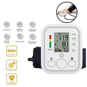 Medidor arterial - medição digital de alta precisão Mantenha as medições arterial e pulsação sempre em dia com este incrível equipamento avançado que realiza leituras da pressão sistólica, diastólica e de pulso, além de detectar arritmia cardíaca e possui indicador de hipertensão. Sua tecnologia inteligente permite o controle da inflação ao nível ideal, proporcionando uma medição mais confortável e precisa. Funções técnicas: - indicador de arritmia. - indicador gráfico de nível de hipertensão. - indicador de batimentos cardíacos. - detecta batimentos cardíacos irregulares - operação simples basta um toque para ligar e medir automaticamente. - desligamento automático: 1 minuto. - recurso de hora e data para até 2 usuários. - mede pressão sanguínea sistólica e diastólica e pulsação frequência cardíaca - memória total de 198 resultados com hora e data. - tela digital lcd: alta resolução e baixo consumo de energia - possui função de voz, fala o resultado obtido em português - possui 2 unidades de medida: kpa e mmhg. - precisão clinicamente comprovada de acordo com os protocolos do inmetro - certificados: ce, iso e rohs - braçadeira com circunferência de 22 cm a 32 cm extra grande , fácil de usar e ajustável. atende aos pacientes obesos . - método de medição: oscilométrico; - medição no braço - alimentação: 4 pilhas aaa ou por entrada micro usb - totalmente automático: controle de inflação e liberação rápida - faixa de medição: - pressão sanguínea: 40mmhg - 280mmhg 5.3kpa - 37.3kpa / - ritmo cardíaco: 40x/min - 195x/min - precisão da medição: - pressão: +-0.4kpa +-3mmhg / - ritmo cardíaco: - 5% - peso: 330g sem pilhas Itens inclusos 01 medidor . 01 estojo para armazenamento 01 braçadeira extra grande 22 cm x 32 cm 01 manual de instruções Produto possui registro e certificação nº 2020202070176 Produto nº 20200328 - gb9706.1-2007 Fda registration certificate fiscal year 2020 nº 10072274 Certificate of conformity fda nº 10064773 Certification europe nº iso13485:2016 Lot: wo2005001 ====================== Dúvidas frequentes - o medidor é à pilha ou fonte Você pode escolher se prefere usar com pilha, ou fonte usb. - o produto é resistente Trabalhamos apenas com produtos com material de altíssima qualidade, durabilidade e procedência. Marca: Não Informado Ean: 7905246686885