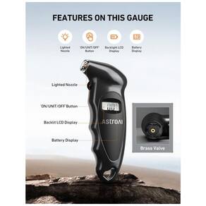 Com uma fonte de energia aprimorada que utiliza 2 pilhas AAA substituíveis ao invés de 3 baterias de célula de moeda, este medidor de pressão de pneus oferece uma vida útil mais longa e facilita a substituição. Sua extremidade iluminada se ajusta facilmente às válvulas dos pneus, proporcionando leituras rápidas e precisas em incrementos de 0,1. Com 4 unidades de medida para escolher, variando de 0 a 150 PSI, 0 a 10 Bar, 0 a 10 Kgf/cm² ou 0 a 1000 KPA. Basta pressionar o botão "Ligar/Unidade/Desligar" para ligar o medidor, selecionar a unidade desejada e ele desligará automaticamente após 20 segundos sem uso para economizar energia. Seu design ergonômico com textura antiderrapante é adequado para todos os tipos de mãos. Essa ferramenta prática e conveniente garante a pressão correta dos pneus, reduz o desgaste e prolonga a vida útil dos pneus para uma condução mais segura. A tela digital oferece leituras claras mesmo em ambientes com pouca luz, eliminando suposições comuns em medidores analógicos. Com um adaptador Presta/Schrader, você pode usar facilmente este medidor em válvulas Presta e Schrader, tornando-o versátil e compatível com caminhões, carros, motocicletas, bicicletas e muito mais.