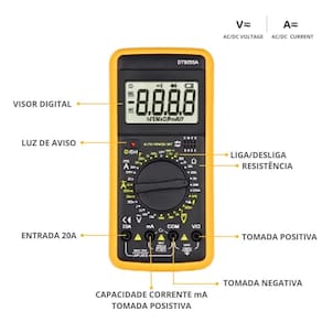 Medidor Multímetro com Função Capacímetro e Tensão Digital Multímetro Digital com Função Capacímetro - Portátil, Multi-Teste, Alerta Sonoro e Iluminação de Função Teste de Diodo; Medição de Corrente AC/DC ; Medição de Tensão e Resistência; Alerta Sonoro Bip para Continuidade; Display Grande e Claro para Leitura Rápida; Luz Indicadora ao Trocar de Função. Destaques do Produto Versatilidade Total para Profissionais Este multímetro digital com função capacímetro é a ferramenta ideal para quem busca precisão e praticidade em diversas medições elétricas. Ele permite medir tensão, corrente, resistência e capacitância, oferecendo recursos completos para profissionais e amadores. Tela LCD de Alta Visibilidade Equipado com um display LCD de 3 dígitos e até 2000 contagens, o multímetro proporciona uma leitura clara e rápida, facilitando o acompanhamento de medições em qualquer ambiente de trabalho. Economia de Energia e Praticidade Com a função de desligamento automático após 15 minutos de inatividade, este multímetro ajuda a conservar a energia da bateria. Ele também conta com indicação de polaridade automática e alerta de sobrecarga, oferecendo mais conveniência e controle ao usuário. Design Compacto e Resistente Leve e de fácil transporte, esse multímetro é ideal para ser levado para o campo ou em viagens de trabalho. Sua construção robusta garante longa durabilidade, resistindo a condições de uso intensivo e proporcionando medições confiáveis a qualquer hora. Segurança e Confiabilidade Desenvolvido com materiais de alta qualidade e dentro dos mais rigorosos padrões de segurança, este multímetro proporciona medições precisas e seguras, além de ser resistente a quedas e impactos leves. Pronto para Uso Imediato Já vem com pilhas inclusas, um par de pontas de prova e manual de instruções, proporcionando tudo o que você precisa para começar a usar o produto imediatamente após a compra. Especificações Técnicas Display: LCD 3 dígitos, leitura máxima de 2000 contagens Função de Polaridade: Automática Indicador de Sobrecarga Over-range : Exibe apenas 1 Indicação de Bateria Fraca: Sim Seleção de Faixa: Manual Temperatura de Operação: 0C a 40C 75% de umidade relativa Temperatura de Armazenamento: -10C a 50C 75% de umidade relativa Desligamento Automático: Após 15 minutos de inatividade Suporte de Mesa: Prático e funcional Funções de Medição Resistência: 200 A 200M Teste de Continuidade: Com alerta sonoro Bip Teste de Diodo: Sim Tensão AC: 2V a 750V Tensão DC: 2V a 1000V Teste de Transistor: Sim Corrente AC: 2mA a 20A Corrente DC: 2mA a 20A Capacitância Capacímetro : 20nF a 2mF Dimensões e Peso Tamanho: 19cm x 9cm x 3,5cm A x L x P Peso: 300g Conteúdo da Embalagem 1x Multímetro Digital com Função Capacímetro e Alerta Sonoro 1x Par de Pontas de Prova 2x Pilhas AAA 1x Manual de Instruções Marca: Não Informado