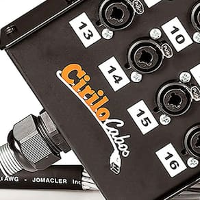 A banheira da Cirilo Cabos feita em metal com pintura epóxi preto, tem uma alça para facilitar o transporte. O cabo espaguetado e numerado via-a-via orienta na usabilidade do produto. Na extremidade do multicabo, tem uma mola de proteção. Esta caixa de conectores é resistente e durável, suporta o ritmo de trabalho de quem produz engenharia sonora.