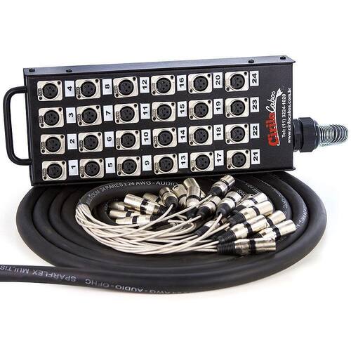 Medusa 24 Vias Montada Com Conectores Cirilo Cabos 35 Metros A medusa de 24 vias montada com conectores da Cirilo Cabos, também conhecida como caixa de conectores ou banheira, oferece organização na distribuição dos seus canais. Ideal para a transmissão de áudio, oferecendo uma melhor qualidade entre os instrumentos e a mesa de som. Conta com alça para transporte e multicabos com molas de proteção. Para que serve a medusaAs medusas montadas pela Cirilo Cabos, são bastante utilizadas para projetos de som, podendo ser ligados cabos de microfones XLR, instrumentos musicais com saídas P10 entre outros. Ao invés de você ter aquele monte de cabos passando pelo palco, você liga a medusa na mesa de som e estica um único cabo para ligar diversos equipamentos, tornando o sistema de som muito mais organizado. Tudo representado muito pouco no custo total. Onde a medusa é utilizada Palcos, Shows, Igrejas, Eventos entre outros. Marca do Multicabo:TiaFlex, SparFlex ou Datalink Conexão: XLR Macho e XLR Fêmea Vias:multicabo 24 vias Isolação: - Termoplástico resistente a altas temperaturas e baixa retração durante a solda. - Condutor dreno de cobre estanhado OFHC + fita de poliéster. - Cobertura em PVC emborrachado de alta flexibilidade e resistência mecânica gravado metro a metro. Garantia: 3 meses Precisa de uma configuração especifica Aqui na Cirilo Cabos nós temos diversas configurações, de 6 vias até 48 vias, podendo ser montadas de acordo com a sua necessidade. Dentro dessa variação de 6 a 48 vias o valor será o mesmo apresentado no site. Qualquer outra configuração acima disso, por favor, consulte nossos vendedores de Segunda á Sexta das 09:00 às 18:00.