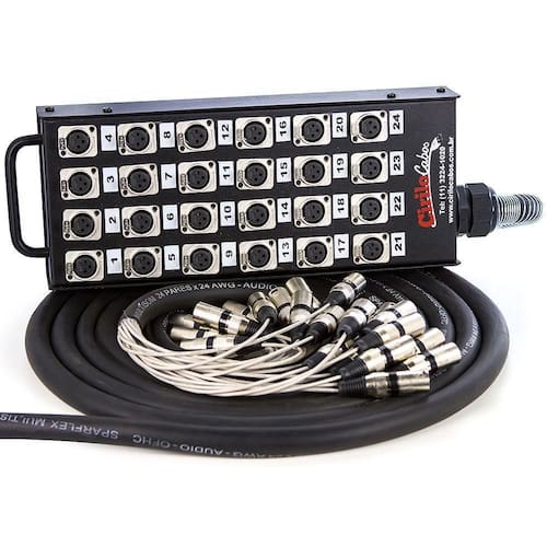 Medusa 24 Vias Montada Com Conectores Cirilo Cabos 35 Metros A medusa de 24 vias montada com conectores da Cirilo Cabos, também conhecida como caixa de conectores ou banheira, oferece organização na distribuição dos seus canais. Ideal para a transmissão de áudio, oferecendo uma melhor qualidade entre os instrumentos e a mesa de som. Conta com alça para transporte e multicabos com molas de proteção. Para que serve a medusaAs medusas montadas pela Cirilo Cabos, são bastante utilizadas para projetos de som, podendo ser ligados cabos de microfones XLR, instrumentos musicais com saídas P10 entre outros. Ao invés de você ter aquele monte de cabos passando pelo palco, você liga a medusa na mesa de som e estica um único cabo para ligar diversos equipamentos, tornando o sistema de som muito mais organizado. Tudo representado muito pouco no custo total. Onde a medusa é utilizada Palcos, Shows, Igrejas, Eventos entre outros. Marca do Multicabo:TiaFlex, SparFlex ou Datalink Conexão: XLR Macho e XLR Fêmea Vias:multicabo 24 vias Isolação: - Termoplástico resistente a altas temperaturas e baixa retração durante a solda. - Condutor dreno de cobre estanhado OFHC + fita de poliéster. - Cobertura em PVC emborrachado de alta flexibilidade e resistência mecânica gravado metro a metro. : 3 meses Precisa de uma configuração especifica Aqui na Cirilo Cabos nós temos diversas configurações, de 6 vias até 48 vias, podendo ser montadas de acordo com a sua necessidade. Dentro dessa variação de 6 a 48 vias o valor será o mesmo apresentado no site. Qualquer outra configuração acima disso, por favor, consulte nossos vendedores de Segunda á Sexta das 09:00 às 18:00. Marca: Não Informado