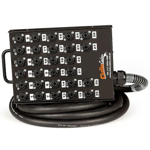 Medusa 48 Vias Com Conectores Combo - Cirilo Cabos 35 Metros Medusa montada pela Cirilo Cabos com conectores Combo, marca própria. A vantagem do combo é poder plugar dois tipos distintos de conectores, o XLR e o P10 plug banana. Na ponta dos cabos vão conectores XLR macho. Este produto é ideal para transmissão de som profissional, sem prejuízos na qualidade ou interferência de ruídos externos. A medusa é um componente indispensável em um sistema de som profissional, ideal para show, eventos e outros. O produto reune diversas vantagens: transmissão de áudio analógico sem interferências eletromagnéticas ou ruídos externos; praticidade na organização do palco, distribuição dos instrumentos e dos músicos; segurança ao reduzir o fluxo de cabos levados até a mesa técnica e economia na compra de cabos. O produto montado pela Cirilo Cabos é composto por 48 vias com Conectores Combo Painel. A estrutura feita em metal com pintura epóxi preto, tem uma alça para facilitar o transporte. O cabo espaguetado e numerado via-a-via orienta para usabilidade do produto. São três marcas de multicabos, usados por profissionais especializados, para montagem das medusas: TiaFlex, SparFlex ou Datalink. As medusas são montadas de acordo com disponibilidade do estoque de cabos multicanal. Além desta configuração a empresa monta pedidos personalizados. Medusa com fabricação artesanal com 6 até 48 vias. Para configurações com canais acima de 48 vias, consulte os vendedores. Canais: 48 Vias Bandeja: 6 x 28,5 x 35 cm Conector painel: Combo Conector cabo: XLR macho Diâmetro do cabo: 27,10 mmMarcas de cabos disponíveis: TiaFlex, SparFlex ou Datalink Condutor: Corda de cobre estanhado OFHC 24 AWG; dreno de cobre estanhado OFHC + fita de poliéster Isolação: Termoplástico resistente a altas temperaturas e baixa retração durante a solda. Precisa de uma configuração especifica Aqui na Cirilo Cabos nós temos diversas configurações, de 6 vias até 48 vias, podendo ser montadas de acordo com a sua necessidade. Dentro dessa variação de 6 a 48 vias o valor será o mesmo apresentado no site. Qualquer outra configuração acima disso, por favor, consulte nossos vendedores de Segunda á Sexta das 09:00 às 18:00.
