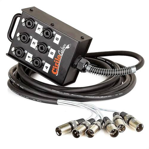 Medusa 6 Vias Com Conectores Combo - 20 Metros Medusa montada pela Cirilo Cabos com conectores Combo da marca Cirilo Cabos. A vantagem do combo é poder plugar dois tipos distintos de conectores, o XLR e o P10 plug banana. Na ponta dos cabos vão conectores XLR macho. Este produto é ideal para transmissão de som profissional, sem prejuízos na qualidade ou interferência de ruídos externos. A banheira da Cirilo Cabos feita em metal com pintura epóxi preto, tem uma alça para facilitar o transporte. O cabo espaguetado e numerado via-a-via orienta na usabilidade do produto. Na extremidade do multicabo, tem uma mola de proteção. Esta caixa de conectores é resistente e durável, suporta o ritmo de trabalho de quem produz engenharia sonora. Este produto vai te auxiliar na organização de palco e distribuição dos canais para instrumentos e músicos. A medusa de som com seis vias é um ponto de ancoragem de palco que vai reduzir o fluxo de cabos levados até a técnica. Com ela você otimiza seu projeto de som, conectando instrumentos com saída P10, cabos de microfone e outros. A Cirilo Cabos oferece as melhores soluções em cabos e conectores. Produto com qualidade e Cirilo Cabos. Especificações Técnicas Canais: 6 Vias Conector painel: Combo Cirilo Cabos Conector cabo: XLR M Cirilo Cabos Diâmetro do cabo: 11,60mm Veias internas 24 AWG: 0,20 mm Marcas de cabos disponíveis: TiaFlex, SparFlex ou Datalink Condutor: Corda de cobre estanhado OFHC 24 AWG; dreno de cobre estanhado OFHC + fita de poliéster Isolação: Termoplástico resistente a altas temperaturas e baixa retração durante a solda Tamanhos Disponíveis na Cirilo Cabos 5, 10, 15, 20, 25, 30, 35, 40, 45, 50, 55, 60, 65, 70, 80, 90 e 100 metros Precisa de uma configuração especifica Aqui na Cirilo Cabos nós temos diversas configurações, de 6 vias até 48 vias, podendo ser montadas de acordo com a sua necessidade. Dentro dessa variação de 6 a 48 vias o valor será o mesmo apresentado no site. Qualquer outra configuração acima disso, por favor, consulte nossos vendedores de Segunda á Sexta das 09:00 às 18:00. : 3 meses Atenção: Verifique a compatibilidade com seu equipamento antes da compra, não nos responsabilizamos por incompatibilidades. Conteúdo da embalagem Medusa 6 Vias com Conectores Combo - Cirilo Cabos