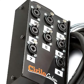 Medusa montada pela Cirilo Cabos com conectores Combo, marca própria. A vantagem do combo é poder plugar dois tipos distintos de conectores, o XLR e o P10 plug banana. Na ponta dos cabos vão conectores XLR macho. Este produto é ideal para transmissão de som profissional, sem prejuízos na qualidade ou interferência de ruídos externos.