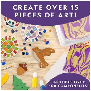 Este kit com 3 em 1 combina nossos 3 kits de artesanato mais populares, incluindo mais de 100 componentes para criar 19 peças de arte únicas! As crianças podem fazer mosaicos deslumbrantes, pinturas marmorizadas hipnotizantes e 4 artesanatos em cerâmica para secagem ao ar!