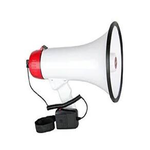 Descrição:Megafone 25w * Megafone poderoso com gravador de mensagens. * Som nítido e forte * Microfone de mão com cabo extensível * Você pode usar infinitamente este megafone com gravador de mensagens e microfone, desde escolas até demonstrações ou reuniões internas ou externas, sem afetar sua enorme potência e cobertura. * Potência: 25 W * Diâmetro: 19,5 cm * Comprimento: 34 cm * Fonte de alimentação: bateria recarregável (não incluída)) ou 6 X Bateria “D” * Distância efetiva: 400M * Alerta de sirene * Controle de volume.