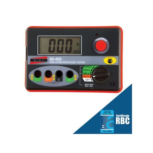MEGÔHMETRO DIGITAL PORTATIL FAIXA 2500V E 20 GIGAOHMS MOD. MI-400 COM CERTIFICADO DE CALIBRAÇÃO ACREDITADA RBC DESCRIÇÃO: Megôhmetro digital portatil faixa 2500v e 20 gigaohms mod. MI-400, incluso certificado de calibração acreditada rbc DESCRIÇÃO CERTIFICADO DE CALIBRAÇÃO: Certificado de Calibração RBC P/ Megôhmetro Sob Procedimento PCI-014 e PCI-039 em Resistência 0 a 500GOHMS e Tensão Alternada de 0 a 1000V em Pontos bem Distribuídos pelas Faixas de Medição Calibração acreditada RBC Procedência: Laboratório de Calibração Instrutherm ESPECIFICAÇÕES TÉCNICAS: Display de Cristal líquido LCD de 3½ dígitos, o valor máximo de exibição no display é de 1999. Escala: 0 - 20G? Tensão de Teste: 500V/1000V/2500V Tensão de saída: Tensão de teste de 90 a 110% Divisão mínima: 0,01M? Precisão: 0 a 200M? ±(3% de leitura + 2 dígitos significantes) 200M? a 1000M? ±(5% de leitura + 3 dígitos significantes) 1000M? a 20G? ±(10% de leitura + 5 dígitos significantes) Tensão AC: 0 a 700V Precisão: ±(1,5% de leitura + 5 dígitos significantes) Categoria: CAT II - 600V Função DATA HOLD: Congela a leitura no display Temperatura de Operação: 0 - 40ºC Umidade de Operação: < 80%UR Alimentação: 6 pilhas de 1,5V tamanho AA Dimensões: 150 x 100 x 70mm Peso: 680g(incluindo pilhas) ACESSÓRIOS FORNECIDOS: Estojo para transporte Ponta de prova com sensor (vermelha) Ponta de prova blindada com adaptador jacaré Ponta de prova tipo jacaré 6 pilhas de 1,5V “AA” Manual de instruções Certificado de calibração acreditada rbc