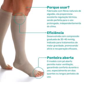 Sua compressão graduada de 30-40 mmHg garante resultados eficazes, enquanto a ponteira aberta proporciona liberdade e ventilação para os pés.
