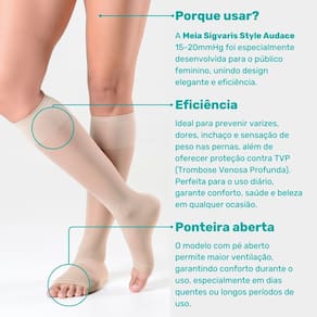 A Meia Sigvaris Style Audace 15-20mmHg foi especialmente desenvolvida para o público feminino, unindo design elegante e eficiência. Ideal para prevenir varizes, dores, inchaço e sensação de peso nas pernas, além de oferecer proteção contra TVP (Trombose Venosa Profunda). Perfeita para o uso diário, garante conforto, saúde e beleza em qualquer ocasião.
