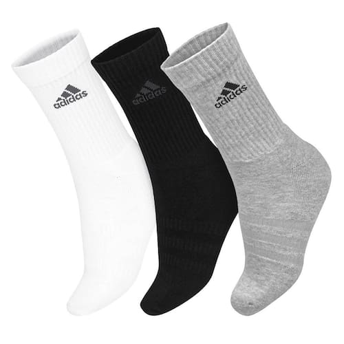 - Detalhamento: Embalagem com 03 pares de meias nas cores branca cinza e preta, cano alto (aproximadamente 14m), escrita Adidas no cano na cor preta, suave compressão na região do médio pé, veste do 38 ao 40, tecido macio;