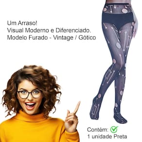 Meia Calça Arrastão Furada Rasgada com Buraco - Modelo Retrô Gótico Punk Rock Halloween. Design moderno, vazado com buracos grandes e pequenos imitando desfiado. Ideal para compor um visual estiloso e diferenciado. Perfeita como acessório de moda com seus vestidos, saias, shorts, salto alto, tênis, botas, coturnos, jeans, etc., proporcionando versatilidade na composição de seus looks preferidos. Confortáveis, deixam suas pernas com uma aparência magra e diferente. Arrase nas festas temáticas, baladas ou festivais. Cor: Preta. Tamanho único: Vesto do manequim 40 ao 46. Possui elasticidade, se moldando ao corpo. Composição: 92% nylon, 8% elastano. Cuidados: Lavar a mão e secar a sombra. Armazenar em embalagem plástica para proteção. A durabilidade do produto depende de seus cuidados. Atenção: Recebemos novas remessas semanalmente e algum detalhe pode variar conforme o lote recebido, porém o produto é o mesmo e mantém a mesma qualidade e característica. Contém: 1 meia calça furada na cor preta. Fotos ilustrativas e reais do produto.