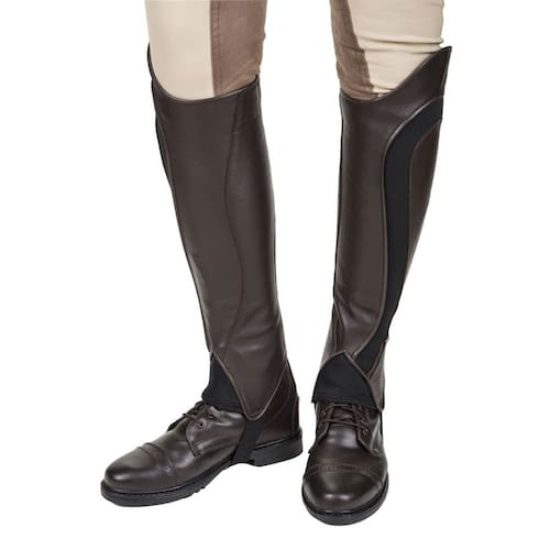 Meias calças femininas TuffRider Derby Leather As meias calças TuffRider Ladies Derby Leather são feitas com couro texturizado e durável e neoprene flexível para um toque adicional de estilo. O design marcante se molda ao contorno da perna enquanto permanece confortavelmente no lugar. O zíper fecha de cima para baixo para facilitar a colocação e a retirada, enquanto o fecho de pressão mantém as calças seguras. Uma alça embaixo do pé e um elástico garantem um ajuste confortável enquanto estiver no selim.