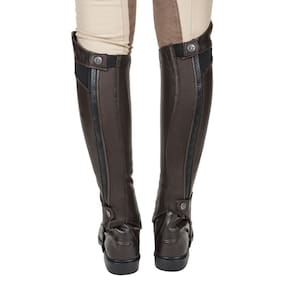 Meias calças femininas TuffRider Derby Leather As meias calças TuffRider Ladies Derby Leather são feitas com couro texturizado e durável e neoprene flexível para um toque adicional de estilo. O design marcante se molda ao contorno da perna enquanto permanece confortavelmente no lugar. O zíper fecha de cima para baixo para facilitar a colocação e a retirada, enquanto o fecho de pressão mantém as calças seguras. Uma alça embaixo do pé e um elástico garantem um ajuste confortável enquanto estiver no selim.
