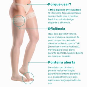 meia compressiva feminina, Sigvaris Style Audace, meia 3/4 natural, prevenção de varizes, meia para pernas cansadas, trombose venosa profunda, meia 15-20mmHg, meia elegante, saúde das pernas, meia coxa compressiva, meia coxa antitrombo, meia compressiva.
