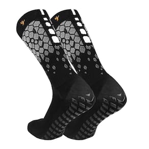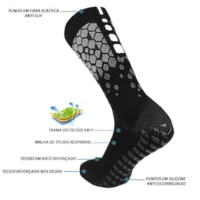 Compressão:  Meias que durante a prática esportiva se ajusta automaticamente o tecido reforçado e com projeto anatômico no calcanhar faz com que fique o tempo todo no local correto