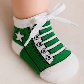 Nossas meias modelo sapatinho com estampa de tênis são perfeitas para manter os pezinhos do seu bebê quentinhos, estilosos e protegidos. Com sola antiderrapante, ajudam a prevenir escorregões quando ele começar a explorar o mundo ao seu redor!