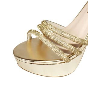 Linha de Meia Pata Salto Alto Fino Luiza Sobreira, produzida em material sintético na cor Dourado com detalhes em strass, com palmilha e forro em P.U., solado em TR.