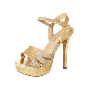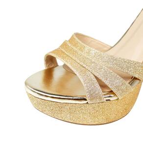 Linha de Meia Pata Salto Alto Fino Luiza Sobreira, produzida em material sintético na cor Gliter Dourado, com palmilha e forro em P.U., solado em TR.