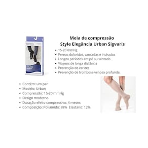 A meia 3/4 panturrilha 193B Urban da Sigvaris é uma meia social lisa, com compressão graduada, desenvolvida para o público masculino. Confeccionada em microfibra, esta meia facilita a transpiração da pele, promovendo à saúde das pernas e o alívio de sintomas como: pernas doloridas e cansadas, tornozelos e pés inchados. Disponível nas cores pretas, bege e marrom. Com design moderno e solado reforçado é um produto ideal para uso diário. Tabela de medidas: Calçado de 36 a 39 / Circunferência Tornozelo de 19 a 25 cm - Tamanho P Calçado de 40 a 42 / Circunferência Tornozelo de 20 a 27 cm - Tamanho M Calçado de 43 a 45 / Circunferência Tornozelo de 21 a 29 cm - Tamanho G Marca: Não Informado Ean: 1029200000008