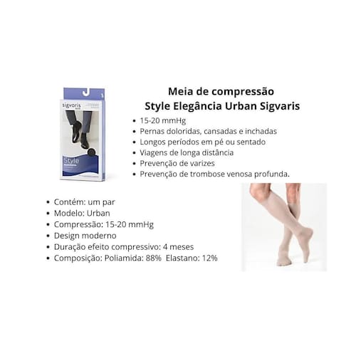 A meia 3/4 panturrilha 193B Urban da Sigvaris é uma meia social lisa, com compressão graduada, desenvolvida para o público masculino. Confeccionada em microfibra, esta meia facilita a transpiração da pele, promovendo à saúde das pernas e o alívio de sintomas como: pernas doloridas e cansadas, tornozelos e pés inchados. Disponível nas cores pretas, bege e marrom. Com design moderno e solado reforçado é um produto ideal para uso diário. Tabela de medidas: Calçado de 36 a 39 / Circunferência Tornozelo de 19 a 25 cm - Tamanho P Calçado de 40 a 42 / Circunferência Tornozelo de 20 a 27 cm - Tamanho M Calçado de 43 a 45 / Circunferência Tornozelo de 21 a 29 cm - Tamanho G Marca: Não Informado