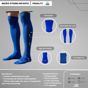 O Meião Storm Infantil da Penalty foi criado para os minis craques jogarem futebol da maneira correta e aperfeiçoarem suas habilidades dentro das quatro linhas. O produto proporciona conforto e maciez aos pés, auxiliando na prevenção de bolhas indesejadas causadas durante as partidas. Além disso, o meião garante ótima absorção e transporte de suor para a camada externa da meia, mantendo os pés secos e arejados.