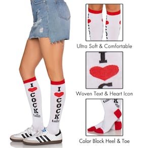 - Divirta-se um pouco ao calçar as meias de festa até o joelho da Leg Avenue. As peculiares joelheiras atléticas apresentam um design colorido, letras ousadas e tecido de malha canelada.