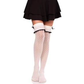 - Meias de crochê sobre o joelho com punho virado e laço de cetim para um visual que certamente impressionará.