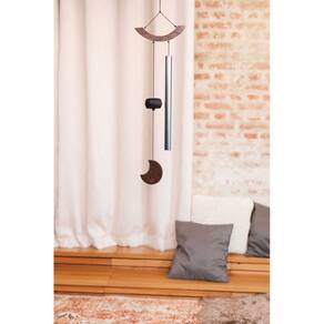 Som suave e relaxante Ressonância duradoura Para meditação, relaxamento, aplicações terapêuticas ou até mesmo para decoração 1 barra de alumínio prateado Símbolo da lua na parte inferior Topo curvo de madeira Pêndulo com altura ajustável Anel de suspensão Afinação: C6 (A4/a' 432 Hz) Material: Alumínio