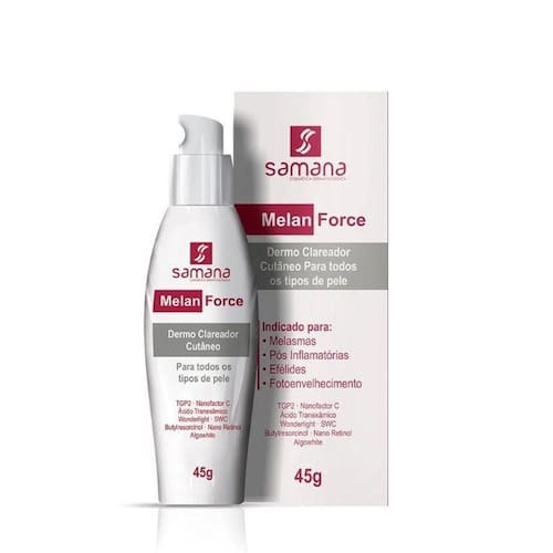 Melan Force Dermo Clareador Cutâneo da Samana é uma loção clareadora composta por ativos que previnem, reduzem e controlam as manchas/Hipercromias faciais. Esta loção é composta por ativos que reduzem e controlam as manchas faciais, como melasmas, hiperpigmentações pós inflamatórias, efélides (sardas) e fotoenvelhecimento.
