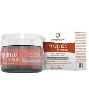 O Melannox Premium é um clareador desenvolvido para o cuidado diário da pele, com fórmula rica em ativos antioxidantes e hidratantes que contribuem para manter a pele com aspecto saudável, uniforme e com sensação de maciez. Sua textura leve e de rápida absorção promove conforto imediato, podendo ser utilizado em todos os tons de pele e em qualquer estação do ano.Benefícios e característicasClareadorSensação de hidratação prolongadaToque seco e confortávelAjuda a manter a aparência uniforme e revitalizadaTextura leveIndicado para todos os tipos e tons de pele.Princípios ativosWonderlight, Mandélico, Fítico, Kójico, Retinol, Mellan Complex, Nanocápsulas de Vitamina C, Albatin, Butylresorcinol, TGP-2 e Alfa-Arbutin.Modo de usarAplique diariamente pela manhã e à noite sobre a pele limpa e seca, massageando delicadamente até completa absorção. Durante o dia, utilize protetor solar.