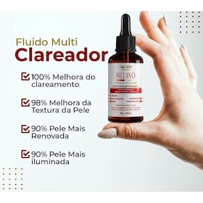 Melano Fluid é um fluido clareador de uso diário, desenvolvido para auxiliar no cuidado completo da pele. Sua fórmula avançada combina ativos que promovem sensação de hidratação prolongada, suavidade e luminosidade, deixando a pele com aparência uniforme e radiante. Textura leve e rápida absorção, indicado para todos os tipos de pele e para uso em qualquer época do ano.Benefícios e característicasSensação de pele hidratada e com textura uniformeClareadorToque confortávelAção antioxidanteTextura leve de rápida absorçãoIndicado para uso diárioLivre de parabenosPrincípios ativosÁcido Tranexâmico, PHE Resorcinol, Bakuchiol, Vitamina C 35, Ácido Ferúlico, Niacinamida, Ácido Kójico e Caviar.Modo de usarPela manhã e à noite, com a pele limpa e seca, aplique o fluido sobre toda a face e espalhe até completa absorção. Não remover. Durante o dia, utilize protetor solar.