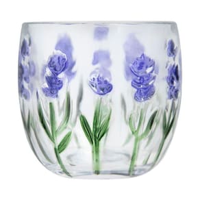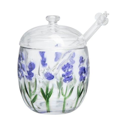 A Meleira Fleur é produzida em vidro cristal. A estampa de lavanda é feita com aplicação em estêncil. Acompanha um leve relevo no contorno das flores, incorporado ao molde, criando textura discreta e percepção tátil na superfície.