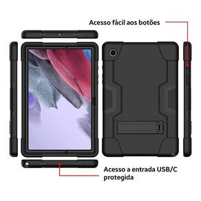 Melhor Capa Para Galaxy Tab A8 X200 Para Criança Anti Impacto Capa Anti-shock Para Tablet Tab A8 10.5 SM- X200 / X205A capa Anti-shock é perfeita para o tablet das crianças, com uma tecnologia de três camadas que absorvem e amenizam o impacto, garantindo proteção contra quedas e arranhões. As bordas da capa tem reforço anti-impacto, principalmente na região da frente, que fica parcialmente coberta contribuindo para a proteção extra da tela do aparelho. Na parte traseira, uma borda no lado da câmera e no leitor de digital impede o contato dos sensores com o chão caso ocorra uma queda. Também com um apoio para posicionar o tablet da forma horizontal e vertical, facilitando o uso. Compatível somente com modelos: SM- X200 / X205 verifique o código SM- do modelo atrás do seu tablet e compare Especificação Técnica da Capa:Pode ser utilizada como capa sem o suporte ou com o suporte na posição paisagemLeve, resistente e fácil de transportarDesign inteligente permite ligar o seu carregador, cabo ou fone de ouvido sem remover a caseCom 3 camadas de encaixe para proteger o seu tablet com acabamento emborrachadoConfeccionada em plástico e borracha de alta qualidade com excelente acabamentoAbertura para botões, abertura para fones, carregador, câmeraProtege contra choques, quedas e arranhões Conteúdo na embalagem:- 1 Capa Anti-shock