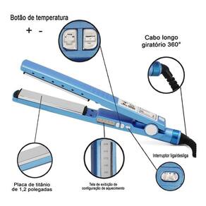 Ola seja bem vindo a nossa loja , nos preocupamos com sua satisfação por issoOferecemos o melhor produto com a melhor qualidade e um otimo atendimento .Prancha profissional titanium - 450f / 232cContém:1un prancha titanium 450f / 232c- disponível na cor:AzulPrancha com design moderno, placas em titânio ideal para processos químicos. Suportam temperaturas muito altas e ajudam a manter a umidade natural do cabelo e proporcionar mais brilho.Possui botão para regulagem para ajustar temperatura da prancha.Além de possuir tamanho de 32mm, que é perfeita para alisamentos e finalizações.Tecnologia mch: faz com que as placas aqueçam mais rápido e de forma constante.Se adequa a qualquer tipo de fios pois possui exclusivo sistema floating places que permite que a mecha fique totalmente em contato com os patins diminuindo o esforço nas mãos dos profissionais. Sendo ideal para qualquer tipo de cabelos e fios.Exclusiva tecnologia ionic que libera milhões de íons por cm que reduzem a eletricidade e estática dos fios eliminando o frizz.Display digital com controle de temperatura, sendo a máxima 232c ou 450f.Compacta e leve sendo muito conveniente para transportar, cabo longo.Possui selo inmetro.Bivolt automático: sem preocupações com a voltagem correta para usoItens inclusos:- 1 chapinha nano titanium