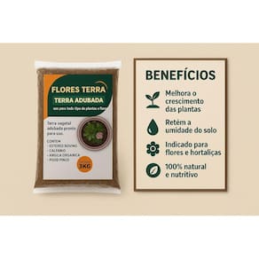 Melhor Kit 5 Terra Vegetal Adubada 3kg - Hortas e Jardins O Kit 5 Terra Adubada Flores Terra 3kg foi desenvolvido para atender a todas as necessidades de quem cultiva plantas, flores, hortaliças ou jardins. Cada saco contém 3kg de terra vegetal adubada, pronta para uso, oferecendo um solo fértil, equilibrado e enriquecido com nutrientes essenciais para garantir plantas mais saudáveis e com desenvolvimento vigoroso. Sua fórmula é composta por esterco bovino, calcário, argila orgânica, pó de pinus e terra vegetal, ingredientes naturais que juntos proporcionam um substrato de alta qualidade. O resultado é uma terra leve, solta e com excelente capacidade de retenção de umidade, permitindo que as raízes respirem e absorvam os nutrientes de forma eficiente. Principais Benefícios: