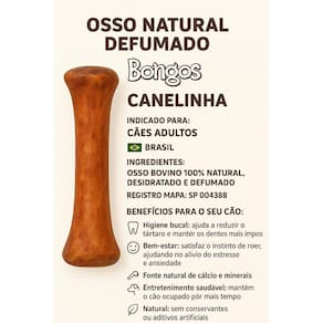 Melhor Osso Bovino Defumado Natural Para Cachorro Kit 4 O Osso Natural Defumado Canelinha Bongos é um produto 100% natural, produzido a partir de osso bovino selecionado, desidratado e defumado sem conservantes ou aditivos artificiais. Desenvolvido especialmente para cães adultos, é ideal para proporcionar saúde, bem-estar e entretenimento ao seu pet. Ingredientes: Osso bovino 100% natural, desidratado e defumado. Indicação: Indicado para cães adultos de todos os portes. Benefícios para o seu cão: Higiene bucal: auxilia na redução do tártaro, ajudando a manter os dentes mais limpos e saudáveis. Bem-estar: satisfaz o instinto natural de roer, contribuindo para o alívio do e da ansiedade. Fonte natural de cálcio e minerais: contribui para a saúde óssea e fortalecimento geral. Entretenimento saudável: mantém o cão ocupado por mais tempo, evitando comportamentos destrutivos. Natural e seguro: sem conservantes, corantes ou aditivos artificiais. Marca: Não Informado
