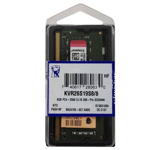 Descrição:  8 GB ddr4 pc2666 para notebook  Memoria 8GB 1Rx8 1G x 64-bit PC4-2666  de notebook  1,2 volts  memória de notebook ddr4 2666 de notebook da kingston Kingston é sinônimo de trajetória e excelência no mercado da tecnologia, especialmente quando se trata de memórias RAM.  Melhorar a capacidade e o desempenho do seu notebook  será fácil com a incorporação duma memória da linha ValueRam,  que atenderá a todas as suas necessidades.  Isso aumentará a produtividade e executará seus programas e aplicativos com maior velocidade. Adaptado às suas necessidades Sua capacidade de 8 GB distribuida em módulos de 1 x 8 GB torna essa memória um soporte ideal para trabalhos  com documentos de grande complejidade, navegação na web com múltiplas abas, jogos, conteúdos multimídia, entre outros. Potencie seu notebook Com sua tecnologia DDR4, você melhorará o desempenho de seu equipe, pois aumentará a fluidez e a velocidade de transferência de dados.  Otimiza o desempenho do seu computador ao máximo e reduz o consumo energético! Seu computador como novo Esta memória de formato SODIMM é ideal para a sua laptop. Instale e começe a aproveitar duma operação ideal! Velocidade para exigentes Se você é fã de jogos online ou usa seu computador para trabalhar com programas ou aplicativos pesados, esta memória é para você.  Graças à sua velocidade de 2666 MHz, você poderá desfrutar dum alto desempenho e realizar seus trabalhos de forma rápida e eficaz Especificações: - Capacidade: 8 GB - Frequência: 2.666MHz - Latência: 19-19-19 - Padrão: DDR4 - Segmento: Notebook - Tensão: 1.2V - Pinagem: 260-pin dimm - Interface: DDR4 PC4-21300