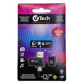 Características: - Marca: UTECH Especificações Técnicas: - Capacidade: 4GB - 3 em 1: Adaptador Micro SD, Micro USB e pendrive - Velocidade de transferencia de dados: 5MB/s escrita e 15MB/s leitura - Conexão: USB 2.0 - Compatível com Windows e Mac iOS Conteúdo da Embalagem: - Pen Drive 3x1, 4gb, Utech, Preto