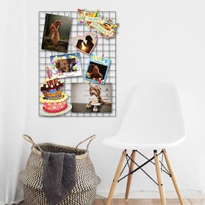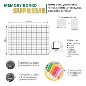 Arame de aço livre de imperfeições com acabamento eletrostática extremamente resistente. Qualidade premium feito com maquinário de última geração Acompanha: 20 miniprendedores coloridos Acompanha: 2 pregos parede de madeira 2 buchas 2 parafusos parede de concreto Medidas aproximadas: 60cm x 80cm Para + ou - 30 fotos 10x15 Pode ser utilizado na vertical ou horizontal. Garantia: 3 mêses contra defeitos de fabricação. Peso: 800 gramas Espessura: 4 mm arame externo 2 mm arame interno Espaçamento: 5cm x 5cm