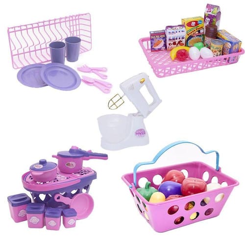 O kit vem com mercadinho com frutinhas, legumes e comidinhas, jogo de panelas com cestinha e potinhos de mantimentos, escorredor com louça, batedeira
