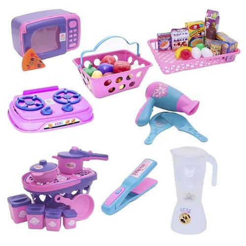 O kit vem com microondas com acessório, fogão cooktop, cestinha com jogo de panelas e potinhos, liquidificador, secador com 2 acessórios, cestinha com frutas e legumes, comidinhas