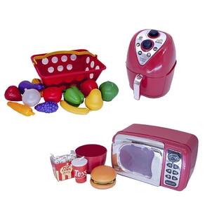 O kit vem com air fryer, mercadinho com frutas e legumes, microondas com comidinhas