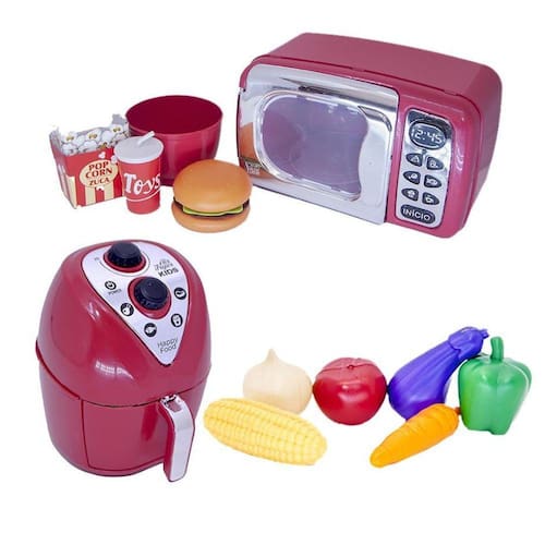 O kit vem com microondas, comidinhas, legumes e air fryer