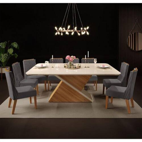 A Mesa Zafira possui um tampo chanfrado de 25mm com cantos curvados e vidro colado, sendo assim uma mesa mais segura e elegante. Além disso ela tem espaço para 8 pessoas, você poderá acomodar amigos e familiares confortavelmente. Aproveite os momentos em família e amigos com muita sofisticação, a Mesa Zafira vai deixar sua sala de jantar com muito estilo e elegância.