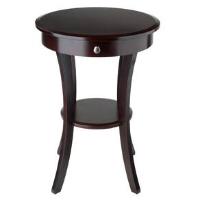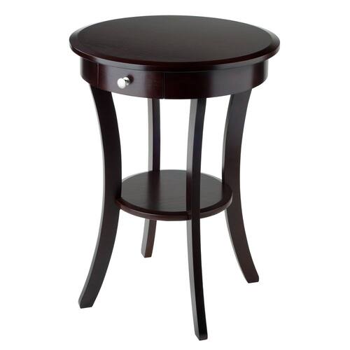 - A mesa Sasha Accent é simples e elegante com seu design curvo que combina bem com qualquer estilo de decoração de cômodo. O topo de madeira maciça de 50,8 cm de diâmetro é grande o suficiente para guardar muitos estilos de decoração, como uma lâmpada, vaso floral ou molduras. Há uma gaveta que puxa para fora da parte superior para armazenamento e prateleira para exibição.